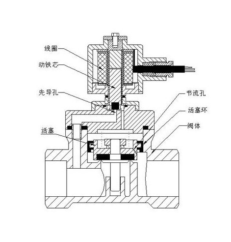 線圈通電后由于吸力作用,動鐵芯下移,把副閥閥塞壓下,副閥關閉,主閥閥杯內壓力上升,當壓力升到一定值時,主閥閥杯的上下壓差一樣,由于電磁力作用,動鐵芯失去主閥閥杯下,壓緊主閥閥座,閥門關閉。線圈斷電時,電磁吸力為零,副閥閥塞和支鐵芯由于彈簧作用向上提起,副閥打開,主閥閥杯上的流體經(jīng)副閥流走,減少了作用在主閥閥杯上的壓力,當主閥閥杯上的壓力減少到一定值時,利用壓差把主閥閥杯推起,主閥打開,介質流通。