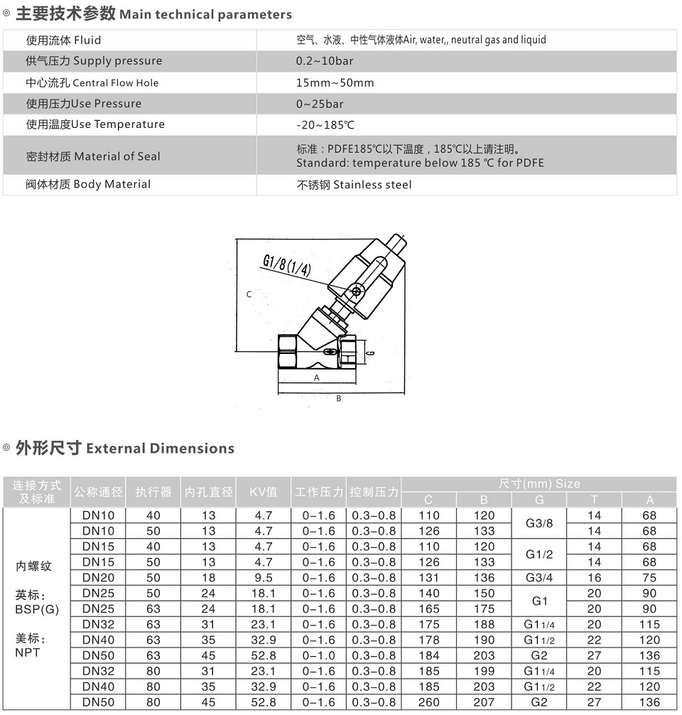本閥為常閉型二位二通活塞角座閥,通入氣源后,在氣壓的作用下推動(dòng)活塞帶動(dòng)閥芯向上運(yùn)動(dòng),將主閥開(kāi)啟,關(guān)閉氣源后在復(fù)位彈簧的作用下將主閥關(guān)閉